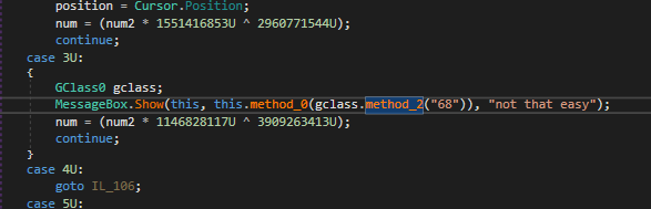 As we can see in the image, there is MessageBox contains method_0 and method_2 which takes “68” as an argument so lets check method_2 :