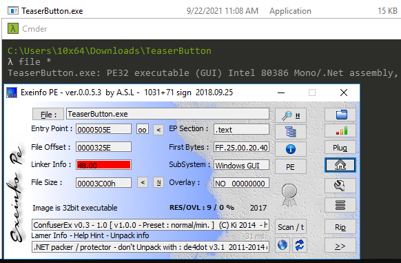 Given an executable, after check it’s type I found that it is PE32 .Net GUI for windows and as we can see in the following image it seems to be packed or something: